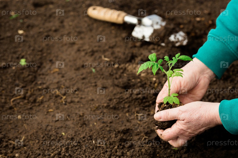 Баннер.Близкий снимок.Руки пожилой женщины, держащей почву с молодым растением.Посадка саженцев в почве.Вблизи находится плечевая лопатка.Концепция сохранения природы и сельского хозяйства