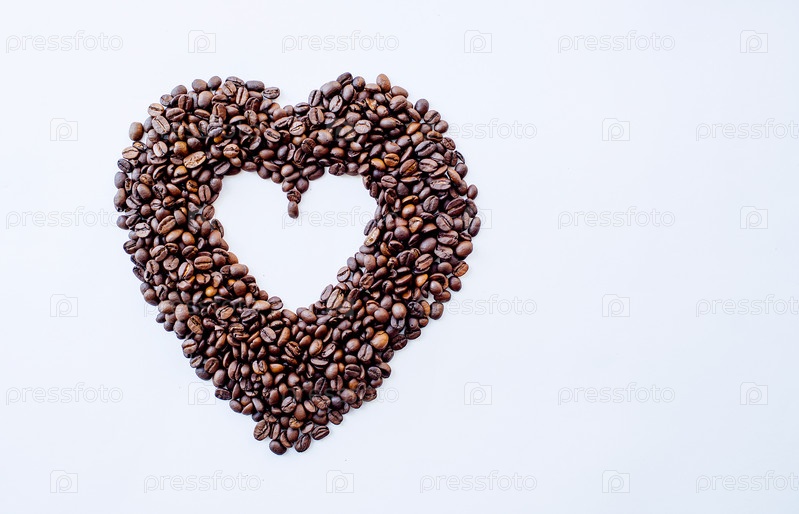 Ингредиент горячего напитка: ароматные, жареные кофейные зерна в форме сердца, изолированные на белом фоне
