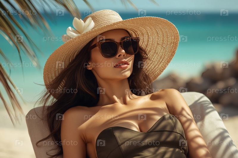 Элегантная, роскошная, красивая женщина на отдыхе, одетая в широкую соломенную шляпу и солнцезащитные очки, сидящая на пляжном кресле в солнечный день