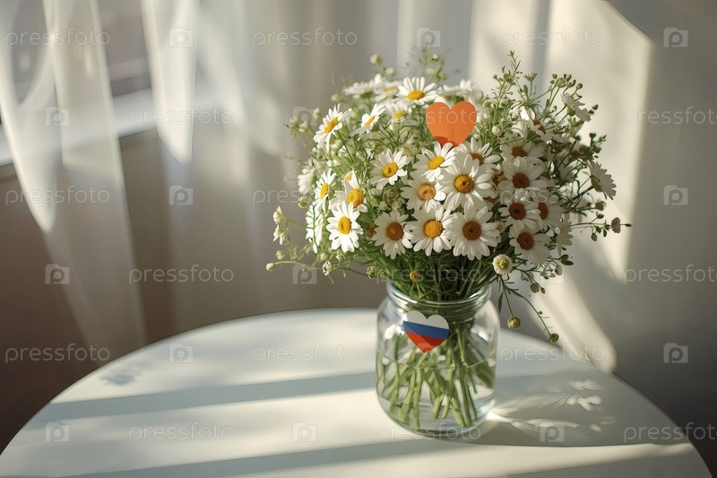 Концепция Дня семьи, любви и верности в России.Красивый, легкий и воздушный букет маргариток в стеклянной вазе на светлом фоне