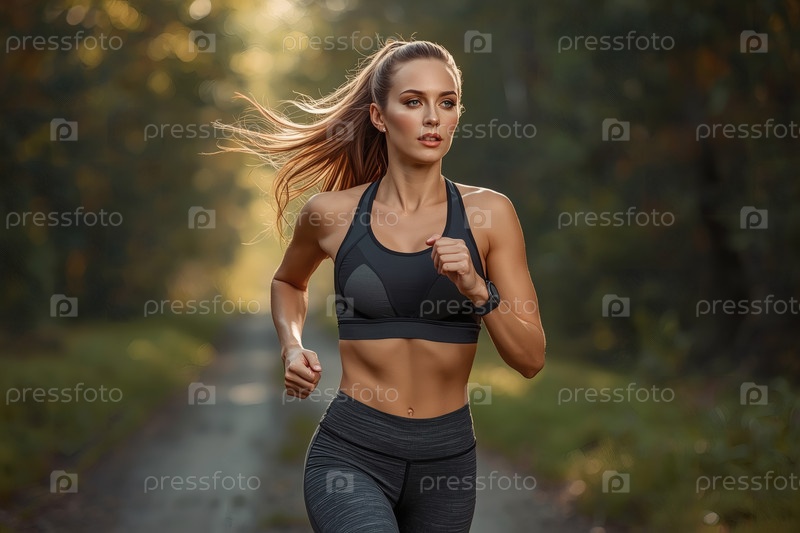 Красивая женщина бегает по утрам в лесу, счастливая девушка с красивой фигурой и спортивной формой