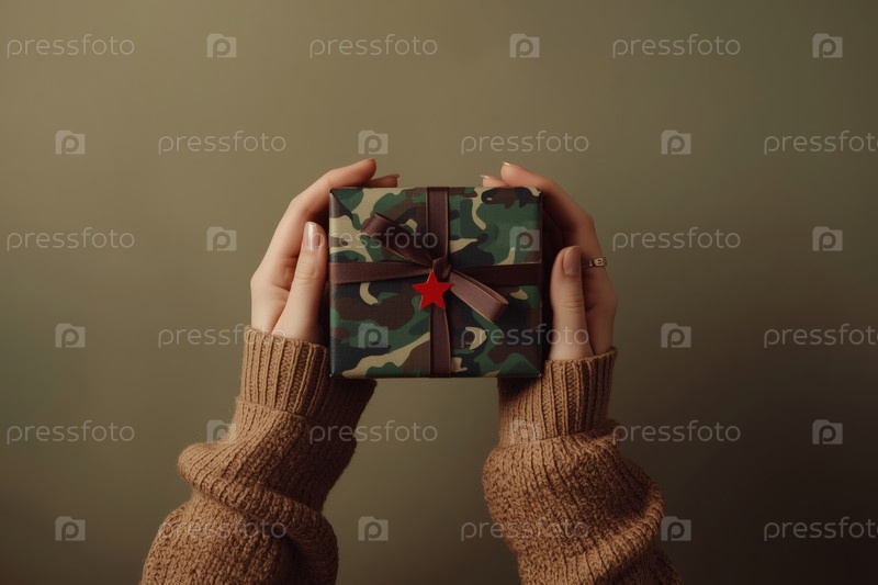 Близкий план женских рук, держащих подарок на День защитника Отечества в камуфляжном оболочке с атласным луком