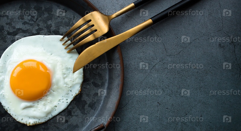 Домашнее жареное яйцо в старинной сковороде и стильные столовые приборы на темном фоне. Вид сверху. Копировать пробелы для текста