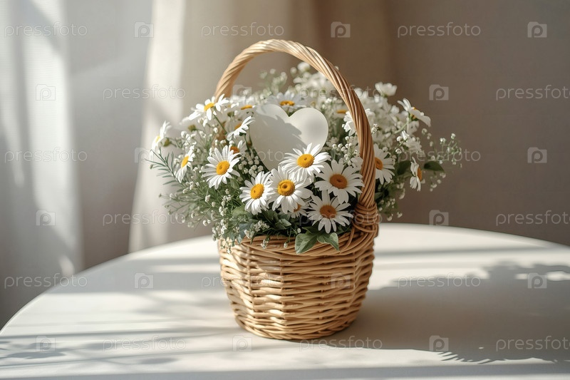 Концепция Дня семьи, любви и верности в России: красивый, легкий и воздушный букет маргариток в плетеновой корзине на ярком столе