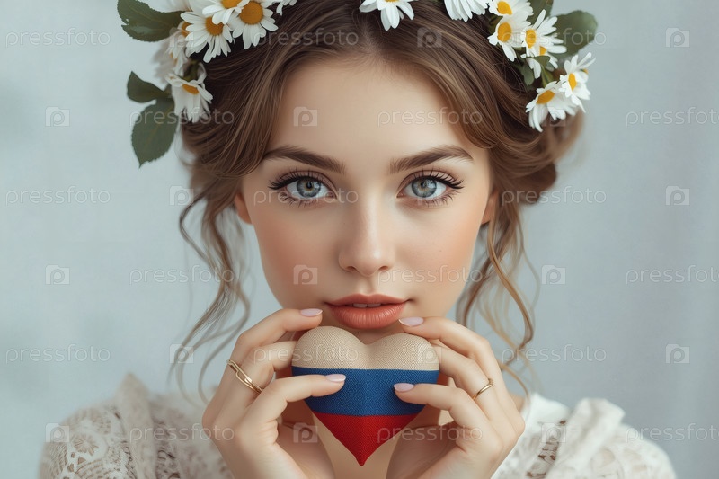 Всероссийский День семьи, любви и верности Красивая девушка с венком ромашек на голове и сердцем цвета русского флага Святой Валентин Петра и Февронии
