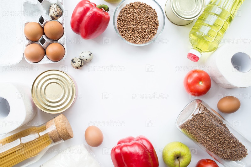 Продовольственные запасы кризисные продукты питания для периода карантинной изоляции Консервированная пища, гречка, макароны, яйца, перец, яблоки, помидоры, масло, сахар, туалетная бумага на белом фоне.Копировать пространство для текста
