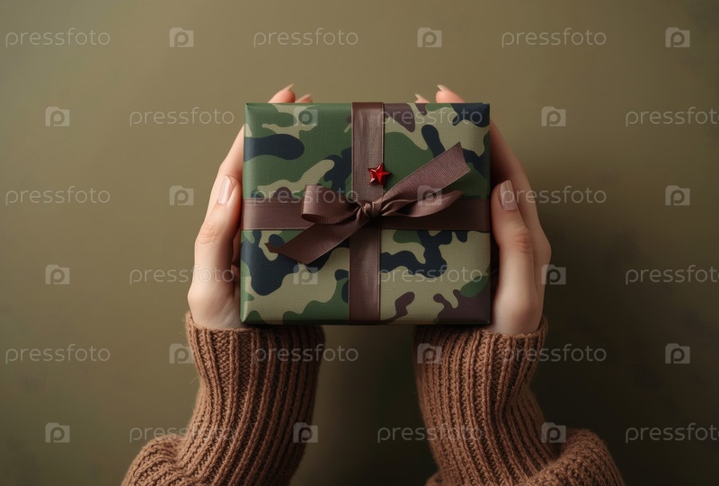 Близкий план женских рук, держащих подарок на День защитника Отечества в камуфляжном оболочке с атласным луком