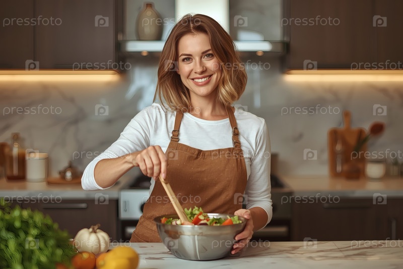 Красивая женщина средних лет готовит в современной кухне