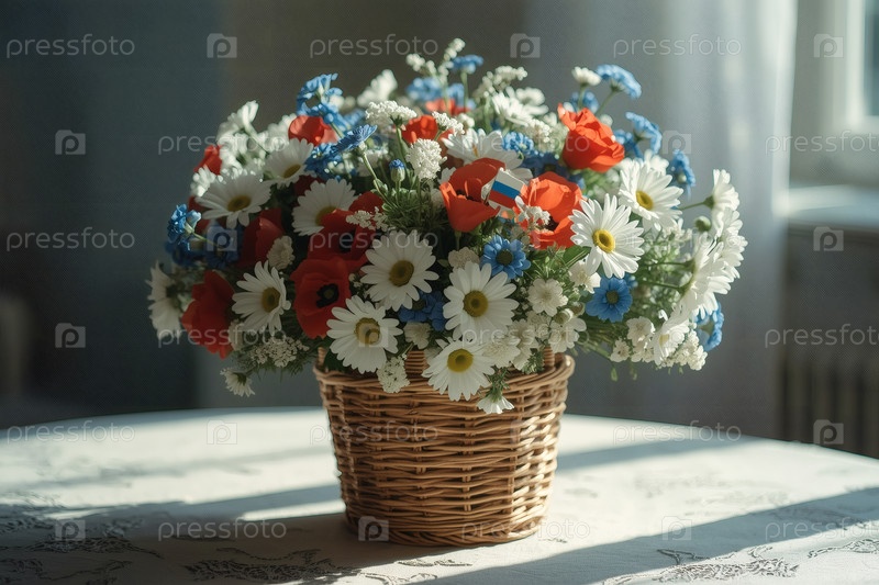 Концепция празднования Дня России - красивый, легкий и воздушный букет белых ромашек, красных маков и голубых кукурузных цветов в плетеновой корзине на ярком столе