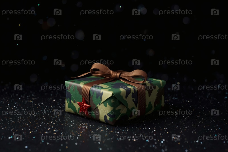Подарочная коробка камуфляжного цвета с праздничной атласной ленточкой на темном фоне.Концепция празднования Дня защитника Отечества 23 февраля