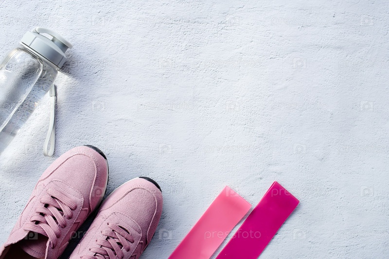 Здоровый образ жизни и фитнес в спорте, утреннее бегство. кроссовки, фитнесоустойчивые эластичные ленты, смарт-трекер для фитнеса, беспроводные наушники и бутылка с водой на сером фоне. вид сверху и плоский слой
