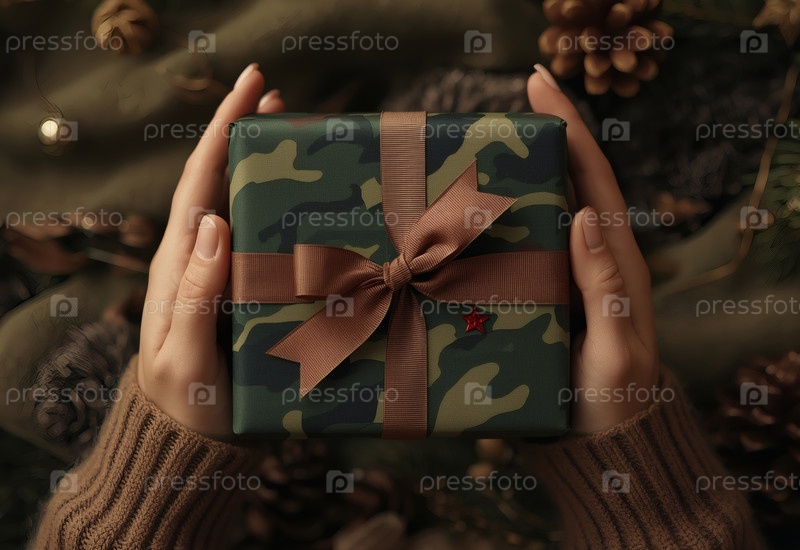 Близкий план женских рук, держащих подарок на День защитника Отечества в камуфляжном оболочке с атласным луком