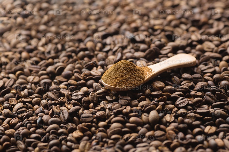 Баннер. Меню кафе и ресторанов. Кофейные бобы и деревянная ложка с измельченным кофе в крупном плане. Копировать пространство для текста. Концепция горячих напитков и рекламы