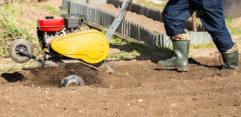 Баннер. Человек Фермер пашет землю с помощью культиватора. Сельскохозяйственная техника: культиватор для обработки земли в саду, моторный культиватор