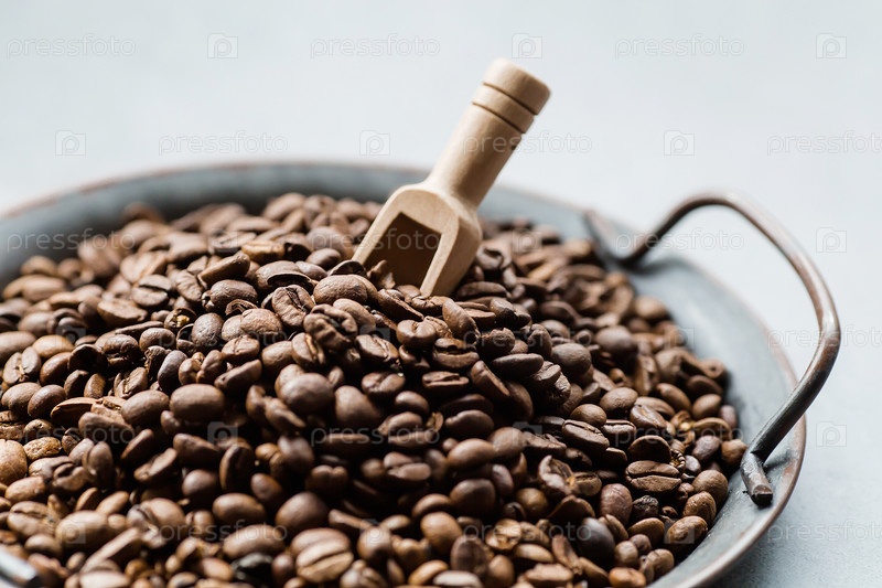 Меню кафе и ресторанов. Кофейные бобы и деревянная ложка на близком расстоянии. Копировать пространство для текста. Концепция горячих напитков