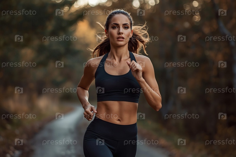 Красивая женщина бегает по утрам в лесу, счастливая девушка с красивой фигурой и спортивной формой