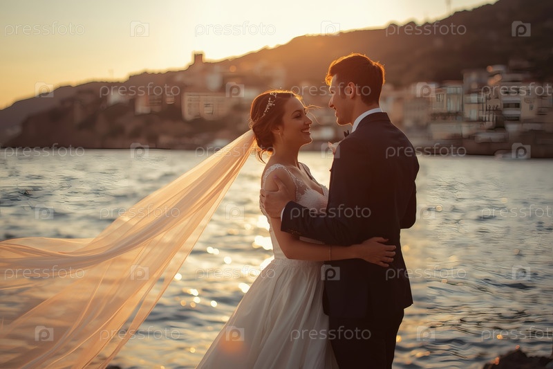 Свадебная пара обнимается у моря при закате солнца счастливые молодожены улыбаются невеста и жених создают семью