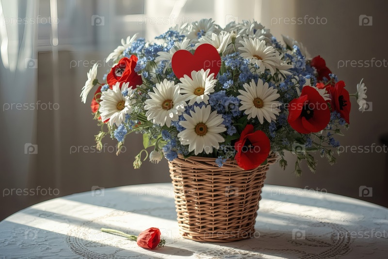 Концепция празднования Дня России - красивый, легкий и воздушный букет белых ромашек, красных маков и голубых кукурузных цветов в плетеновой корзине на ярком столе