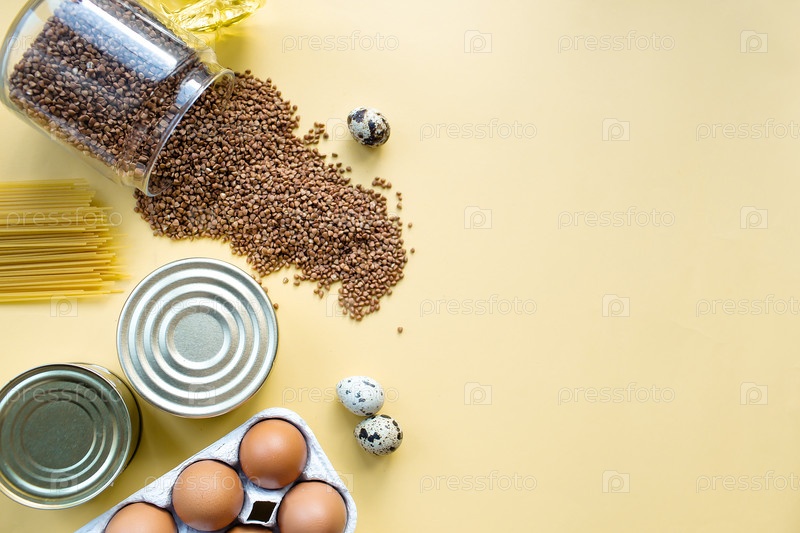 Кризис продовольственных поставок, запасы пищи для карантинного периода изоляции на желтом фоне