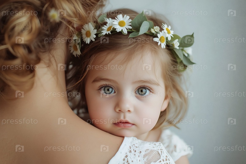 Концепция Дня семьи, любви и верности в России.Маленькая девочка с венком ромашек на руках у матери