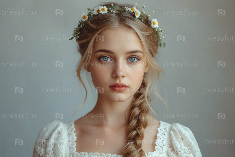 День России или День семьи, любви и верности.Портрет красивой девушки с венком ромашек на голове