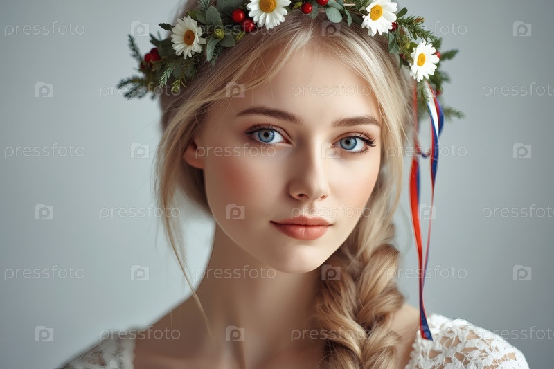 День России или День семьи, любви и верности.Портрет красивой девушки с венком маргариток на голове и лентами в цветах российского флага