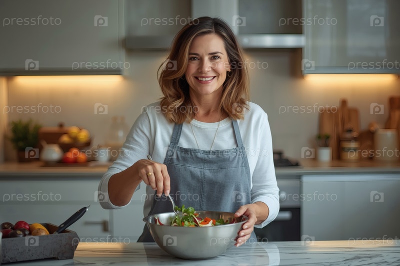 Красивая женщина средних лет готовит в современной кухне