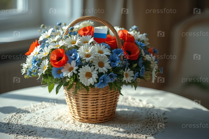 Концепция празднования Дня России - красивый, легкий и воздушный букет белых ромашек, красных маков и голубых кукурузных цветов в плетеновой корзине на ярком столе