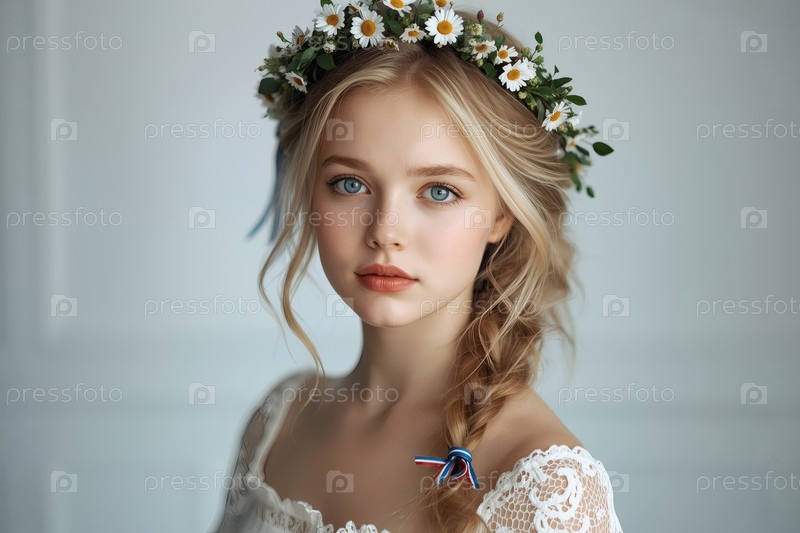 День России или День семьи, любви и верности.Портрет красивой девушки с венком маргариток на голове и лентами в цветах российского флага