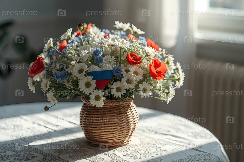 Концепция празднования Дня России - красивый, легкий и воздушный букет белых ромашек, красных маков и голубых кукурузных цветов в плетеновой корзине на ярком столе