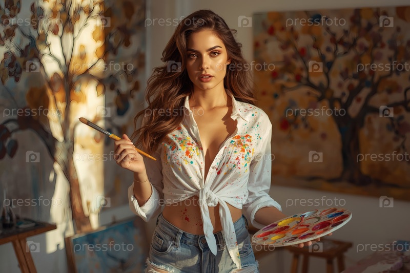 Концепция творческой деятельности. Красивая девушка-художник в своей студии с масляными красками и кистью в руках. Искусство, креативность и расслабление
