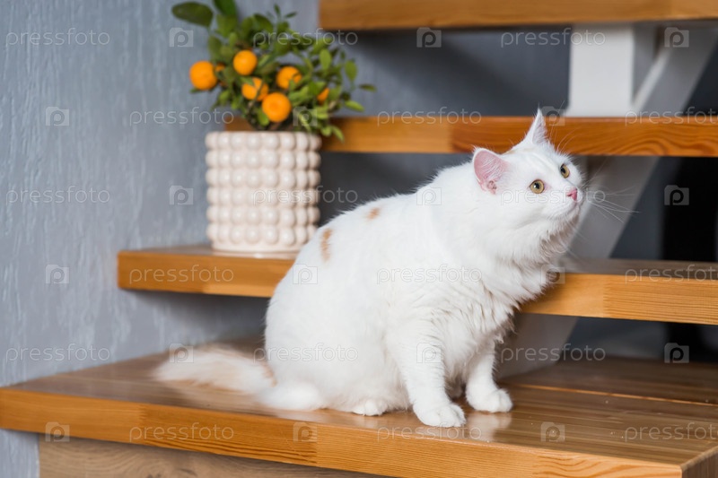Молодой белый пушистый кот сидит на лестнице в доме