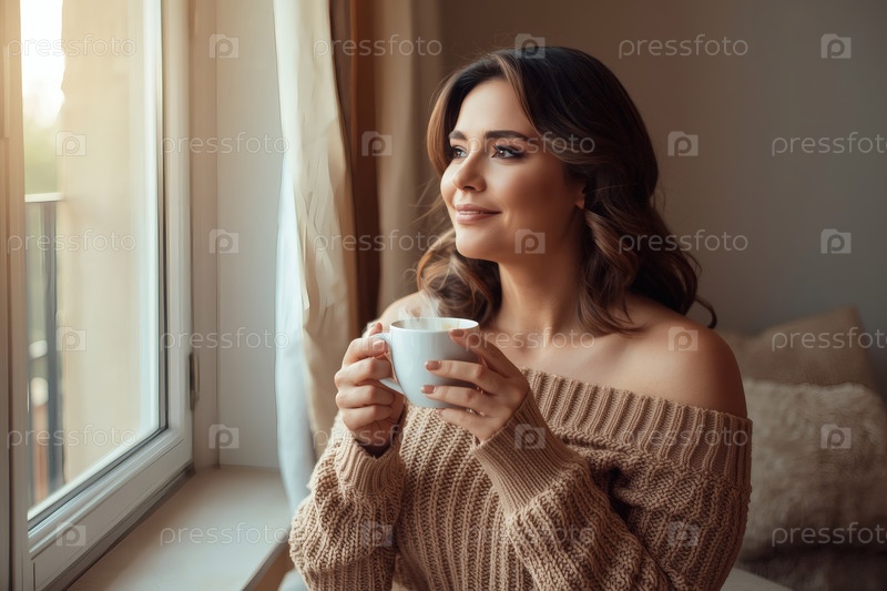 Красивая девушка у окна, пьет кофе из кружки в пастельной гостиной, сидит на стуле дома при естественном свете