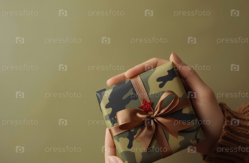Близкий план женских рук, держащих подарок на День защитника Отечества в камуфляжном оболочке с атласным луком