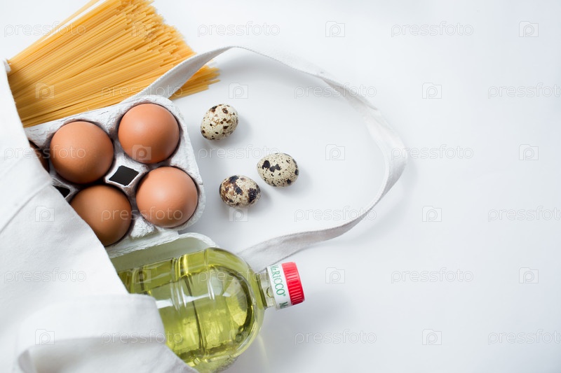 Продовольственные поставки кризисные запасы продовольствия на период карантинной изоляции. Консервированная еда, макароны, яйца, подсолнечное масло в полотенце из холста на белом фоне. Копировать пространство для текста