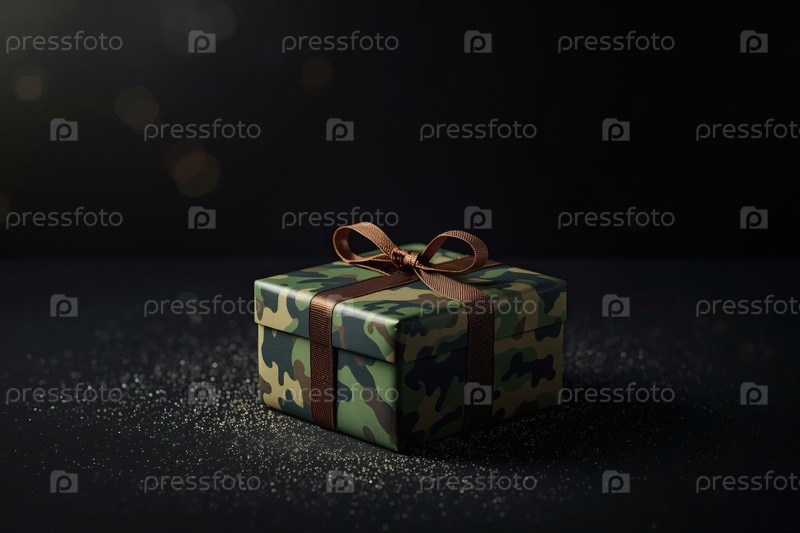 Подарочная коробка камуфляжного цвета с праздничной атласной ленточкой на темном фоне.Концепция празднования Дня защитника Отечества 23 февраля