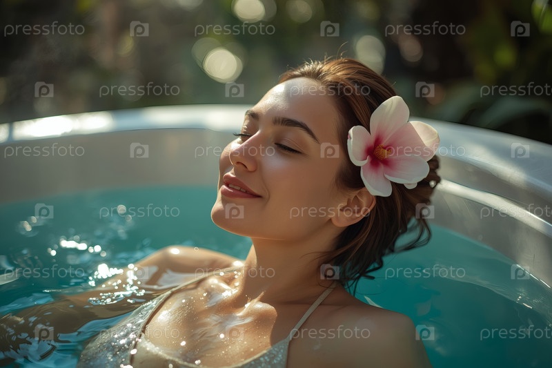 Молодая красивая женщина в бирюзовом бассейне Концепция здорового образа жизни, отдых, расслабление, туризм, косметические спа-процедуры на базе красоты, любовь к себе