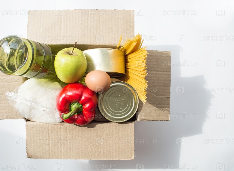 Продовольственные запасы кризисные продукты питания для периода карантинной изоляции Консервированная пища, макароны, яйца, красный перец, яблоки, подсолнечное масло, сахар в коробке на белом фоне.Копировальное пространство для текста