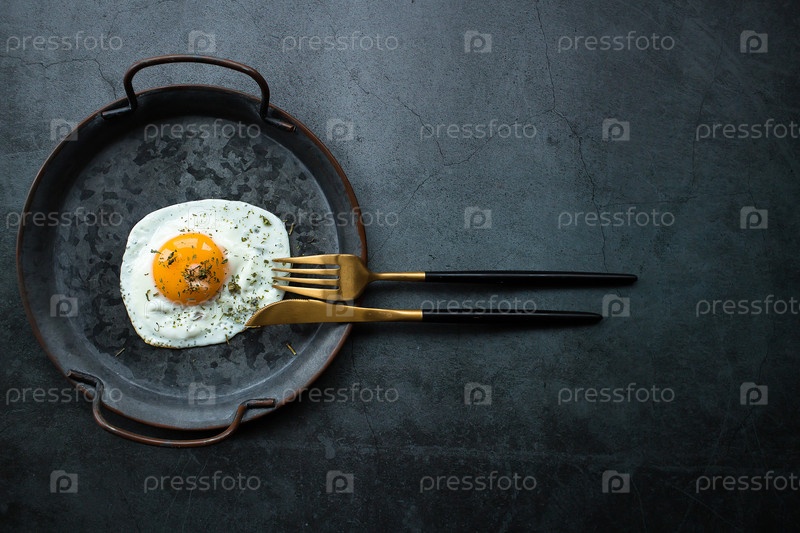 Домашнее жареное яйцо в старинной сковороде и стильные столовые приборы на темном фоне. Вид сверху. Копировать пробелы для текста