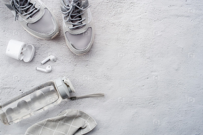 Здоровый образ жизни и фитнес в спорте, утреннее бегство. кроссовки, смарт-трекер для фитнеса, беспроводные наушники и бутылка с водой на сером фоне. вид сверху и плоский слой