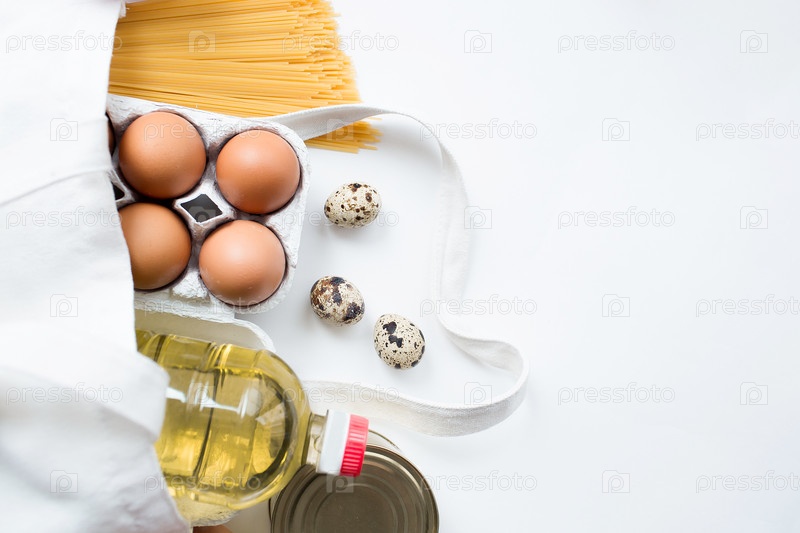 Продовольственные поставки кризисные запасы продовольствия на период карантинной изоляции. Консервированная еда, макароны, яйца, подсолнечное масло в полотенце из холста на белом фоне. Копировать пространство для текста