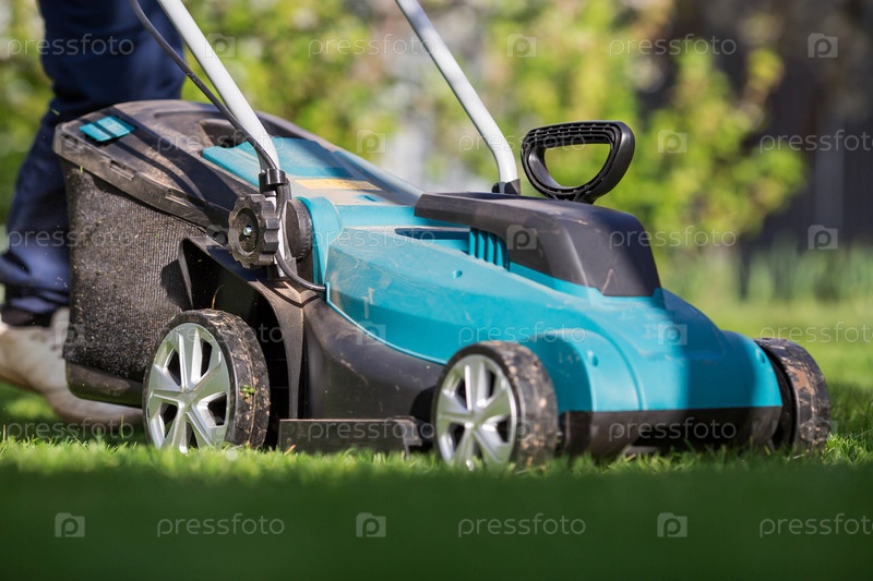 Уборка дачного домика. мужчина с газонокосилкой стрижет траву на заднем дворе. сельскохозяйственное оборудование для содержания сада