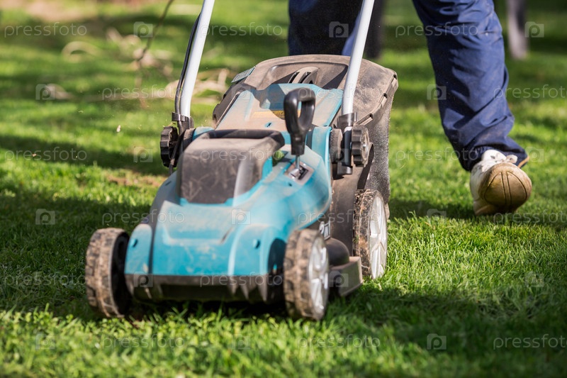 Уборка дачного домика. мужчина с газонокосилкой стрижет траву на заднем дворе. сельскохозяйственное оборудование для содержания сада