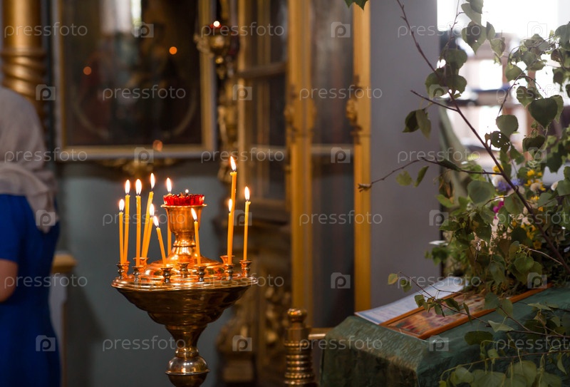Православная церковь.Многие свечи в металлической миске во внутренней части церкви.Церковь внутри