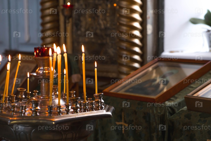 Православная церковь.Многие свечи в металлической миске во внутренней части церкви.Церковь внутри