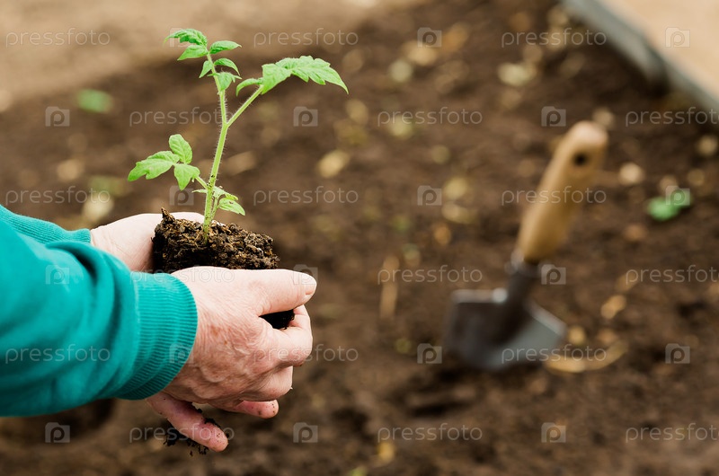 Баннер.Близкий снимок.Руки пожилой женщины, держащей почву с молодым растением.Посадка саженцев в почве.Вблизи находится плечевая лопатка.Концепция сохранения природы и сельского хозяйства