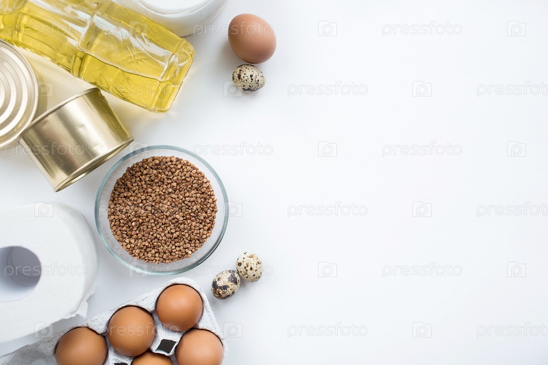 Продовольственные поставки кризисные запасы продовольствия на период карантинной изоляции Скан-продукты, макароны, яйца, гречка, туалетная бумага на белом фоне.Копирование пространства для текста
