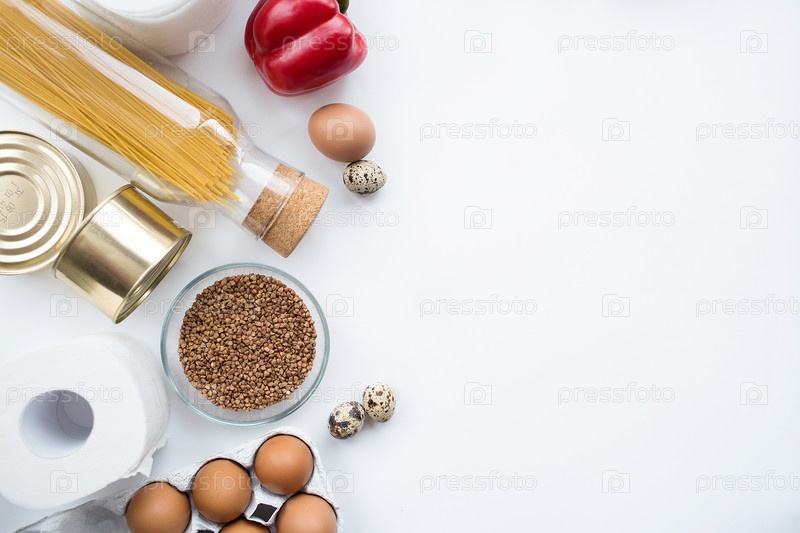 Продовольственные поставки кризисные запасы продовольствия на период карантинной изоляции Скан-продукты, макароны, яйца, гречка, туалетная бумага на белом фоне.Копирование пространства для текста