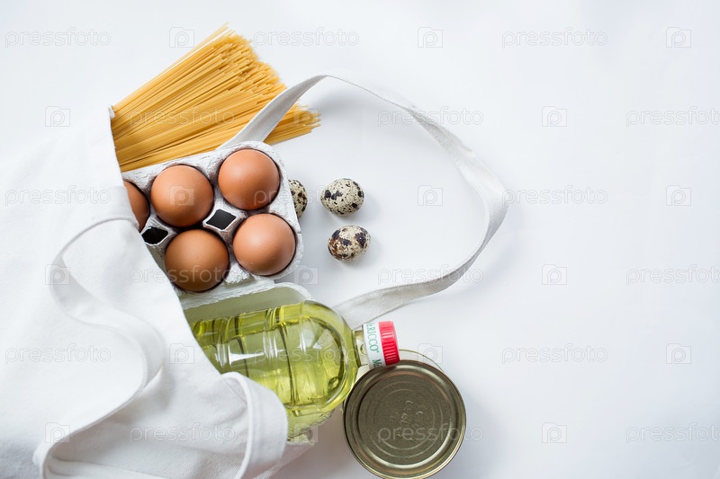 Продовольственные поставки кризисные запасы продовольствия на период карантинной изоляции. Консервированная еда, макароны, яйца, подсолнечное масло в полотенце из холста на белом фоне. Копировать пространство для текста