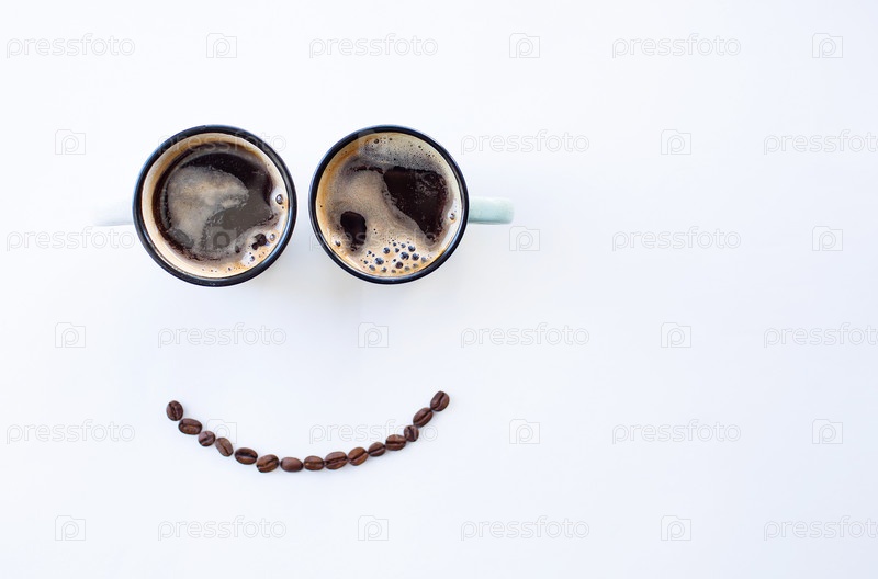 кафе и рестораны. две чашки кофе и улыбка из кофейных зерен. место для надписи. концепция горячих напитков и доброго утра